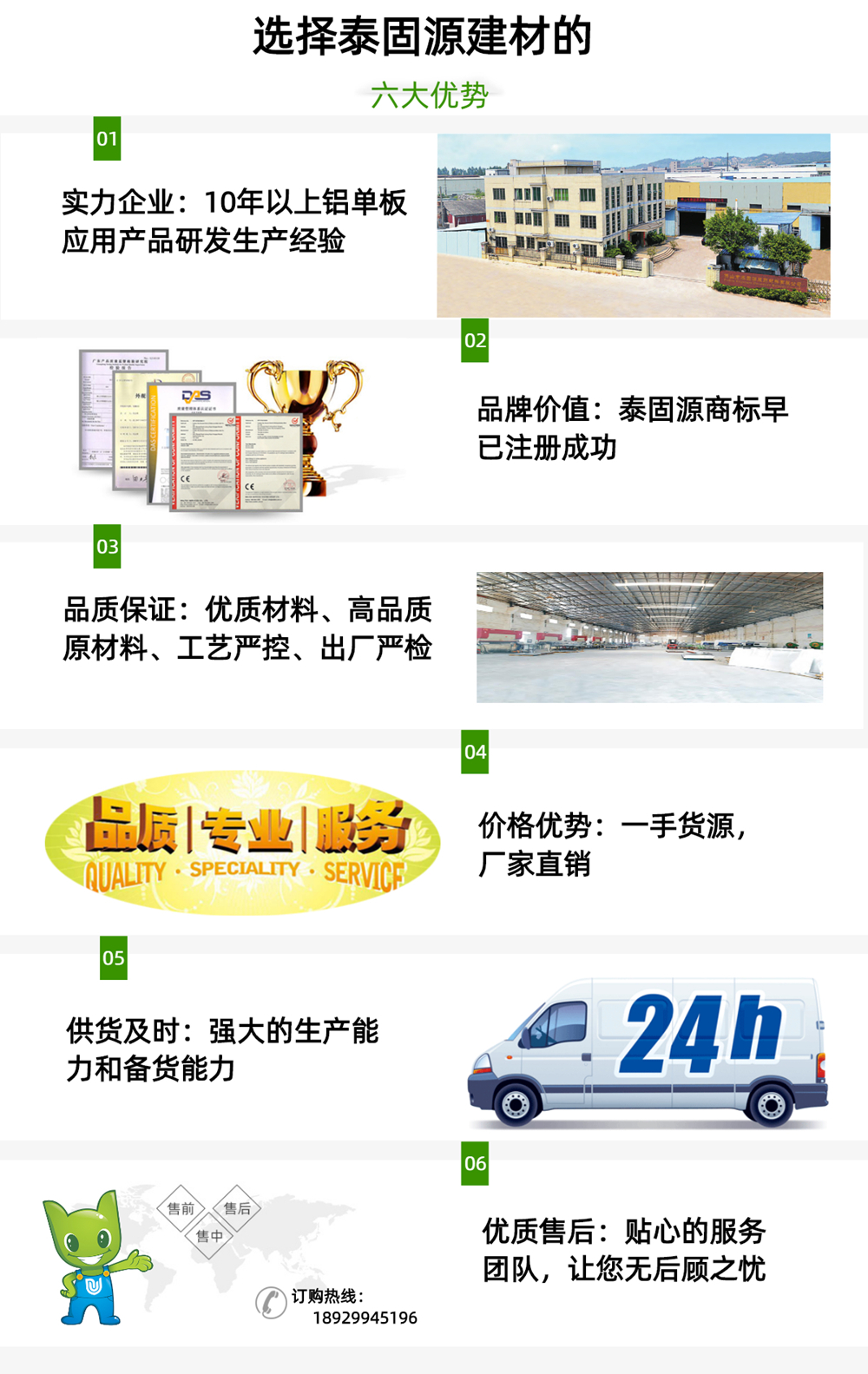 關于我們佛山市泰固源裝飾材料有限公司是一家研發(fā)、生產鋁單板和陶土板、航空板三大系列的大型企業。公司成立于二零一零年,鋁單板占地面積10000平米,陶土板占地面積300畝。擁有環(huán)境優(yōu)雅、寬敞、明亮的現代化標準廠房及辦公大樓。位于佛山市南海區里水勝利工業園,地理位置優(yōu)越。我司技術實力強大,生產管理科學嚴謹。它在引進意大利生產設備的基礎上,立足于持續革新制造工藝,使各項技術指標遠遠超出國家及行業標準,跨入先進水平行列,在經濟和社會效益方面取得了巨大的成就。我司自主研發(fā)、生產泰固源鋁單板,泰固源陶土板這兩大系列產品,多年來,經過公司全體員工的通力協作,我們的品牌產品(泰固源,辛源牌)得到業內人士一致認可。銷售網點遍布國內,并與諸多國內外客戶建立了長期友好的合作關系,產品銷往國內并走向世界